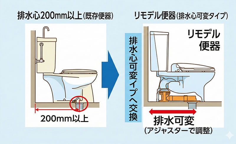 既存のトイレが275~590mmの排水芯の場合、排水位置を移動させる大掛かりな工事を避けたいときに、リモデル便器が現実的な解決策となります。