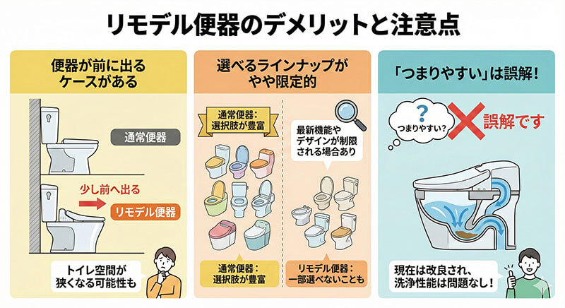 リモデル便器は排水位置を変えずに交換できる便利な商品ですが、通常便器と比べたときにいくつか注意しておきたいポイントもあります。ここでは、導入前に知っておきたい代表的なデメリットと、その影響や対策を整理しておきます。