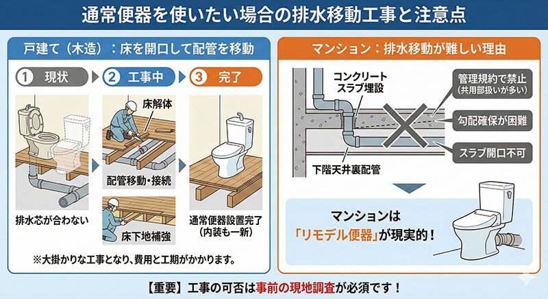 | 排水位置を移動して通常便器 | 床を開口し配管を組み替えた上で通常便器を設置 | 便器のデザインや機能を優先したい場合 |