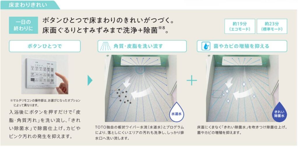 入浴後にボタンを押すだけで、TOTO独自の「きれい除菌水」を床に吹きつけ、除菌・洗浄する機能です。カビやピンク汚れの原因菌を抑制するため、週末の重労働だった床掃除の頻度を劇的に減らせます。
