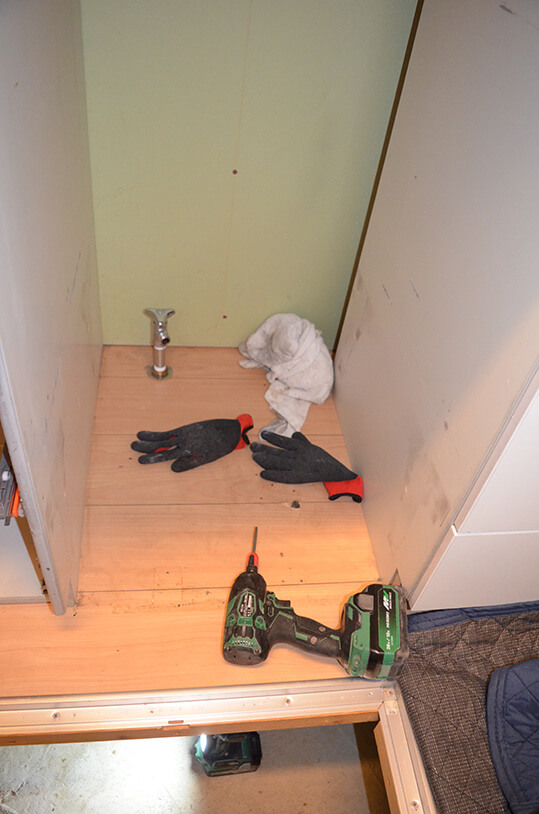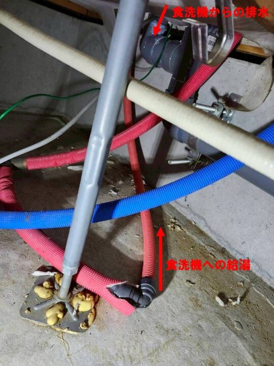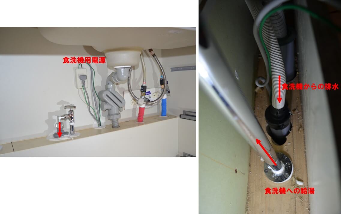 ①既存食洗器撤去 ②床下で食洗機の給湯・排水工事 ③シンク下の食洗機の給湯・排水管 ④新規食洗機設置