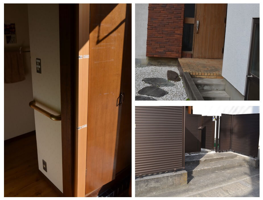 以前リフォームをしたY様から、実家の母が玄関ステップで転倒したので手すりを取り付けたいと連絡をいただきました。 打合せの結果下記3か所に手すりを取り付けました。 1.玄関内部上がり框部に縦手すり 2.玄関外のステップ部に歩行補助手すり 3.門扉外のステップ部に歩行補助手すり 今回は介護保険の住宅改修費を活用し30%の自己負担で済みました。
