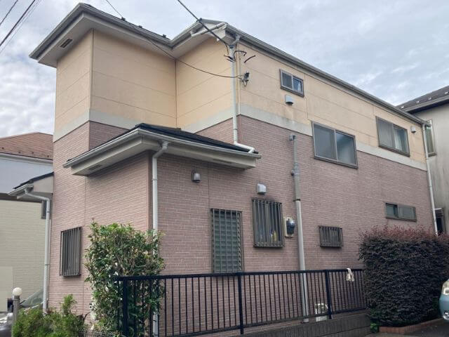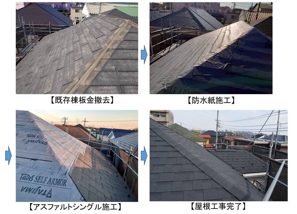2年半前に外装改修の見積もりを提出したOB様から、強風で屋根の一部が脱落したので保険申請用の見積もりを作成してほしいと依頼がありました。既存の屋根材がノンアスベストの脆い屋根材だったので部分補修ではなく、カバー工法で見積もりを作成いたしました。屋根の改修で足場を設置するので、外壁の塗装を同時に行うことになりました。ご主人が単身赴任で、奥様も平日仕事で不在のため、毎日の作業の進捗は写真で報告し、完成後は工事写真ファイルを作成しお渡ししました。