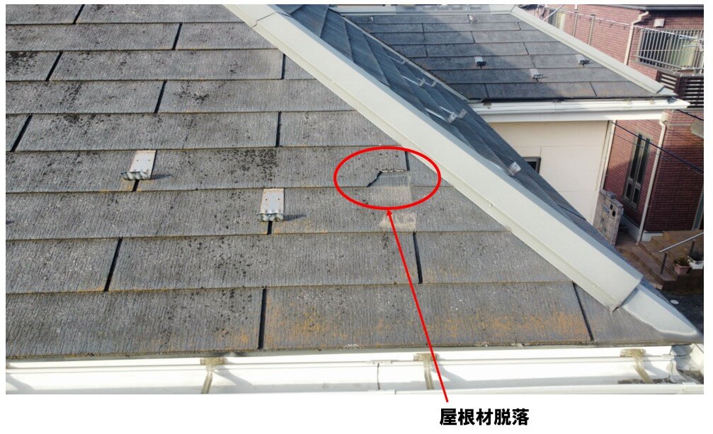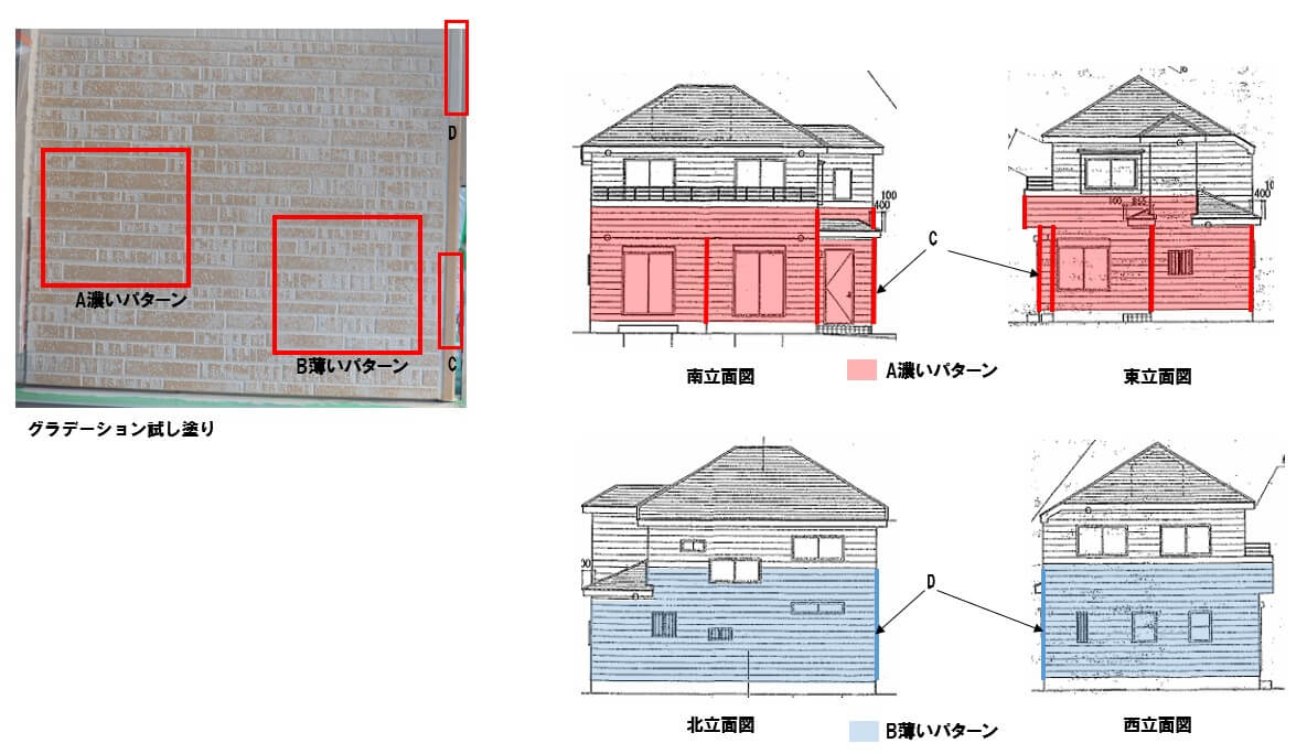 ①屋根材が一部脱落 ②外壁は幕板下の部分はグラデーション塗装としました。グラデーション塗装は奥様の要望で、試し塗を行い、南東の壁を濃く、北東の壁を薄くしました。 ③バルコニー防水工事 ④屋根カバー工法