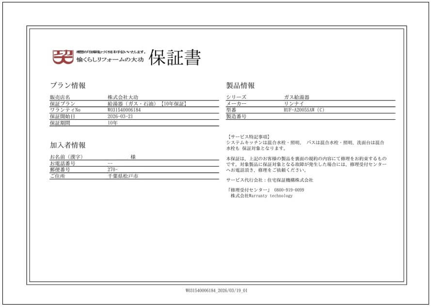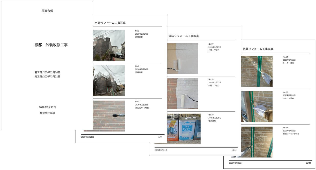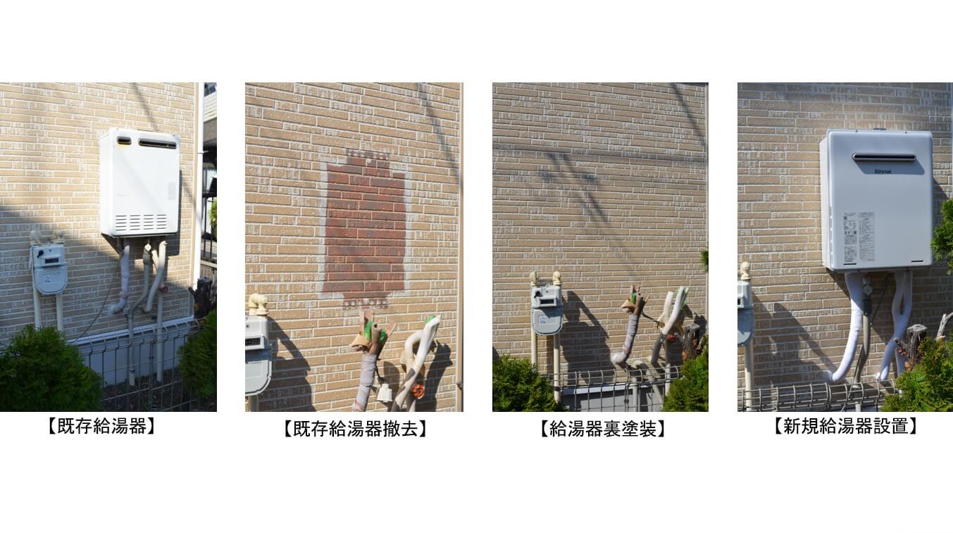 ①給湯器も交換し、給湯器裏も塗装しました。 ②毎日の作業の進捗は写真で報告し、完成後は工事写真ファイルを作成しお渡ししました。 ③外装工事は工事保証書を発行しました。 ④給湯器は10年の延長保証を付保しました。
