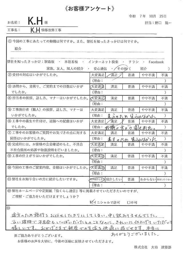 遠方のため施行をお任せしきりにしてしまい、申し訳ありませんでした。 古い建物で不具合もいっっぱいだったとのことなのに、キレイに仕上げていただいて嬉しいです。おかげさまで新居での生活を快適に過ごせます。本当にありがとうございました。